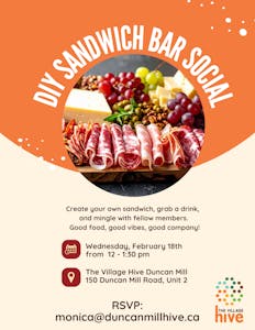 Create your own sandwich, grab a drink, and mingle with fellow members. Good food, good vibes, good company! RSVP: day prior with monica@duncanmillhive.ca
